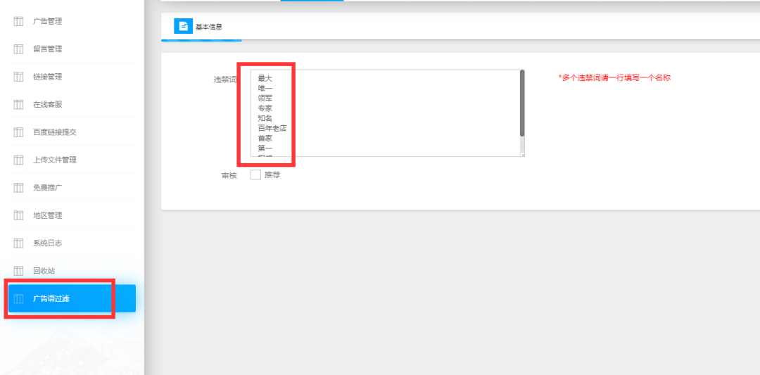 廣告法規(guī)定越來(lái)越嚴(yán)格,廣告詞成了企業(yè)的不敢碰觸的“炸彈”。對(duì)此,此次“萬(wàn)家燈火CMS系統(tǒng)”的升級(jí),可在編輯框中自定義自己領(lǐng)域中的違禁詞,讓網(wǎng)站遠(yuǎn)離“危險(xiǎn)”更安全。