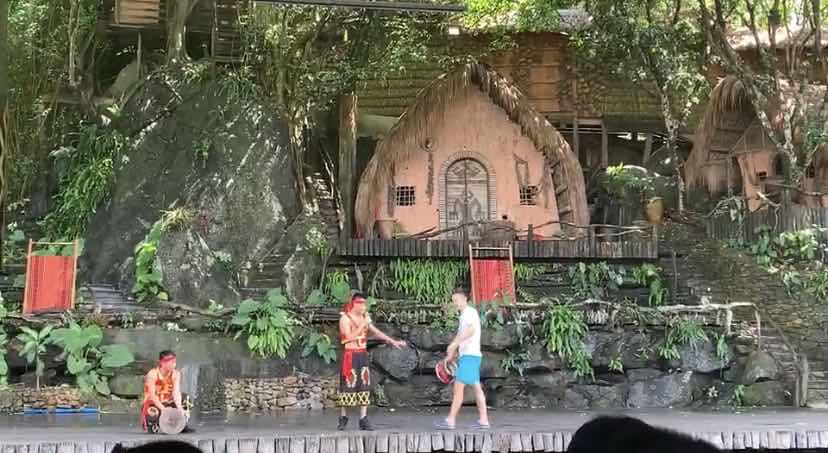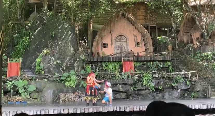 檳榔谷這個黎族山寨,四周是滿山遍野的檳榔,保留著原生態(tài)的熱帶景觀。在這里,他們盡情欣賞原著居民的民族風情、觀看高山火海表演、感受《檳榔?古韻》的實景演出、品嘗黎苗風味美食,好不自在。