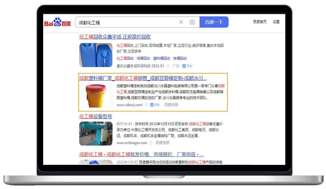 官網(wǎng)優(yōu)化:成都化工桶、成都豆瓣桶、成都橢圓塑料桶、成都防凍裂桶等關(guān)鍵詞,均在百度首頁展現(xiàn),準(zhǔn)確鎖定有需求的客戶。